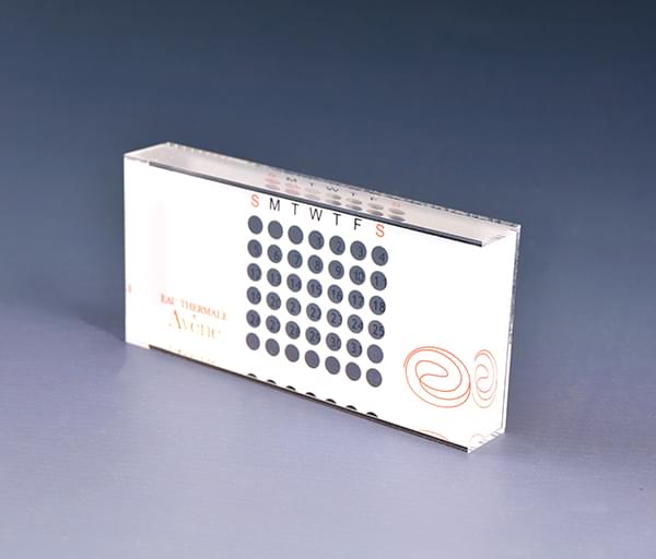 星空无限传媒官网台曆,國外客戶定製的一款星空无限传媒官网台曆,產品由兩部分組成,透明的薄外框中間印(yìn)1-31的數字,內嵌一(yī)塊厚的星空无限传媒官网,厚的星空无限传媒官网背麵印白底與logo,兩塊亞(yà)克力橫向移動即(jí)可切換不同的日期.