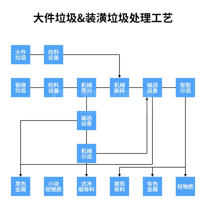 大件垃圾破碎機(jī)係統(tǒng),包括(kuò)進料、破碎、篩分、除鐵、除塵(chén)、自(zì)動化控製等工藝,將大件垃圾由整化零,變廢為寶,實現對大件垃圾中可回收物件以及材料的回(huí)收,實現大件垃圾的資源化。