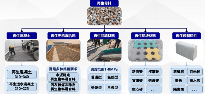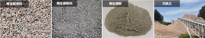 建築垃圾資源化過程中經(jīng)過破碎、篩分(fèn)和除雜等環節,產(chǎn)出再生粗骨料、再生細骨(gǔ)料、再生微粉、冗餘土、黑色金屬、木(mù)材、輕質雜物等幾類產物,可供進一步的處置或(huò)再(zài)生利用。