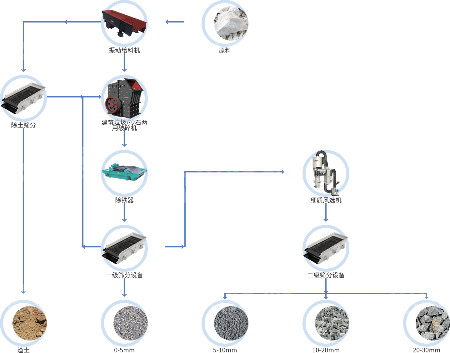 “二合一”生產線是什麽呢?該生產線是指通過專用設備、合(hé)理的工藝布局,將建築垃圾、砂(shā)石骨料處理生產工藝合二為一,可根據砂石骨料的岩石特性及建築(zhù)垃圾的不同構成進行靈活配置,專(zhuān)用設備(bèi)合(hé)理搭配,輔助及工藝設備共用,處置產能不變,廠房占(zhàn)地麵積顯著縮減,投入成本大幅降低,大大提(tí)高設備運轉率,從而創造更大(dà)的經濟效益。